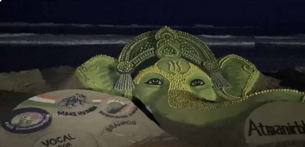 விநாயகர் சதுர்த்தியை முன்னிட்டு ஒடிசா மாநிலம் பூரி கடற்கரையில் விநாயகர் சிலை மணல் சிற்பத்தை வடிவமைத்துள்ளது.