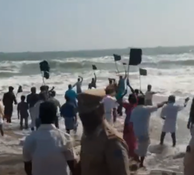 மயிலாடுதுறை மாவட்டம் தரங்கம்பாடி மற்றும் வானகிரி கிராம மீனவர்கள் கடலில் இறங்கி போராட்டம் நடத்தி வருகிறார்கள்.