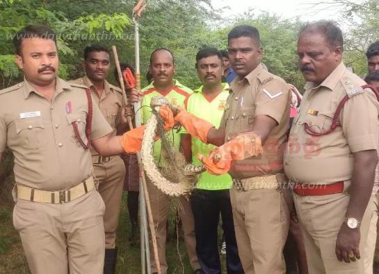 இதைக் கண்ட மீனவர்கள் உடனடியாக தீயணைப்பு துறைக்கு தகவல் தெரிவித்தனர். பின்னர் சம்பவ இடத்திற்கு வந்த தீயணைப்பு துறையினர், மலைப்பாம்பை எச்சரிக்கையுடன் பிடித்து பாதுகாப்பாக வனத்துறையினரிடம் ஒப்படைத்தனர்.