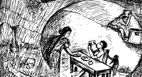 வானம் பார்த்த பூமியாக இருந்த அந்த நிலத்தில், திடீரென ஒரு நாள் மேகங்கள் திரண்டு மழை பெய்யத் தொடங்கியது. அந்த மழையினால் தர்மன் விதைத்த பயிர்கள் செழித்து வளர்ந்தன. நெல், பருப்பு மற்றும் காய்கறிகள் என அறுவடைக்குத் தயாராகின. இங்கு மழை, உண்பவர்களுக்குத் தேவையான உணவுப் பொருட்களை உருவாக்கியது.